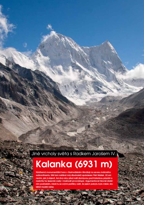 Ve čtvrtém dílu příběhů o lezeckých zážitcích z celého světa představuje Radek Jaroš expedici z roku 2010 na monumentální horu, která se nachází na severu Indie v Garhwálském Himálaji. Severní stěna Kalanky byla pro malou expedici velkou výzvou, počasí si ale nenechá poroučet a velké množství napadaného sněhu ve vysokých výškách rozhoduje o lezeckých úspěších dobře připraveného týmu. Příběh je také o tom, že je třeba si stále připomínat heslo: „Hrdinů jsou plné hřbitovy“, více na stranách 11-15.