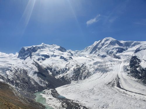 Sraz v sobotu 14. v 6 h v Neuchâtelu, Cedrica jsme nabrali v Yverdonu a přes Lausanne až do Täsch, kde jsme nechali auto. Vláčkem do Zermattu a lanovkou na Rotenboden (2815 m). Po sněhu ani památky, celá cesta vede zhruba po vrstevnici asi 5 km na jižní straně údolí Gornergletscheru, takže jsme si dali hodinu a čtvrt v přezkáčích s lyžema na batohu. Když jsme se začali navlíkat do lyží, sedáku a tak, Cedric zjistil, že zapomněl pípák. No nevadí, poslední sníh napadl někdy v půlce dubna, tak snad nebude potřeba. Cesta přes ledovec jednoduchá, bez navázání, až na jednu strmější pasáž, s fixníma lanama, ale i to šlo celkem v klidu. Trochu těžší oříšek byl malý skalní hřebínek, přes který se s lyžema na batohu sestupuje na Monterosa Gletscher. Lyže se tam dost zachytávaly do ocelových lan. Nasazení lyží pak byla epizoda sama pro sebe, sněhová krusta se propadala a dost lidí skončilo po stehna ve sněhu, dostat se ven byla docela práce (zejména když zapadla i druhá noha). Pak už jen dojezd jarním sněhem k Monte Rosa Hütte.
