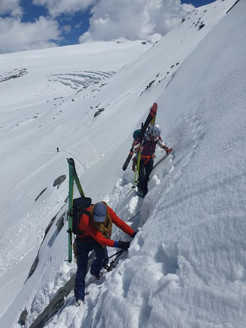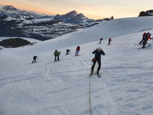 Jenže svah se sklání víc a víc a my nevíme, jestli jsou tam trhliny nebo ne. Včera jsme sice nějaké stopy viděli, ale nevíme přesně kde. Nasazujeme pásy a smiřujeme se se zacházkou přes Monterosa Hütte. V tu chvíli přijíždí skupina teenagerů s dvěma vedoucíma a mažou přímo na námi zamýšlený sjezd. Rychle pásy dolů a za nima. Čeká na krásný prudký sjezd, nejlepší z celého výletu, dokonce se tam dalo i carvovat. Díky tomu dorazíme přímo k hřebínku s ocelovými lany, který jsme slézali den předtím. Teď to jde hůř, lano mám já, lyže se pletou do lan, mlátí o skálu, začínáme toho mít dost. Ale je to za námi, poslední strmější kousek, nasadit lyže a teď už jen dojezd k traverzu podél Gornergletscheru.