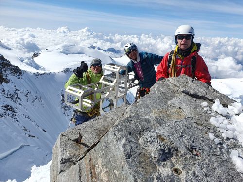 Asi po hodině nasazujeme nože, strmější ledovatější kousek to vyžaduje. Pak už zase bez nich stoupáme po Monterosa Gletscheru do asi 4000 m. Krátká pauza, lezeme do sedáku, navazujeme se na lano a navlíkáme bundy, protože i přes jasnou oblohu je dost zima. No aspoň se nepotíme. Pořád hlídáme tempo, ale zatím jde překvapivě dobře. Přes strmou ledovou trhlinu se dostáváme v 8 h na Sattel (4335 m), kde je depot de ski. Zbývá ještě asi 300 výškových metrů skalnatým hřebenem až na vrchol. Pár prudkých sněhových stoupání dá docela zabrat, odpočíváme co pár kroků. Lezení naštěstí celkem jednoduché, i když v přezkáčích s mačkama to má svá specifika. Claire-Lise a mně dochází trochu morál, klidně bychom to i otočili, ale Cedric samozřejmě že ne, ať jdeme dál, a tak jdeme a přes jedno trojkové lezení s fixním lanem stojíme v 10 h na vrcholu nejvyšší hory Švýcarska.