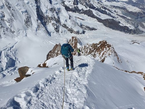 Počasí nádherný, slunce, výhledy všude okolo, užíváme si to, dokonce i fotku uděláme. Nicméně cesta zpátky je dlouhá, takže to balíme a přes hřeben zpátky. Trochu se to komplikuje, proti nám jde několik skupinek a musíme čekat. Na posledních úsecích se mně a Cedricovi uvolní mačka, zbytek jdeme v jedné, jen s cepínem. Na depot de ski nasadíme lyže a hurá dolů. Sníh je ovšem to nejhorší, co se dá představit, natátý a přes noc zmrzlý stopy, po pár otočkách následuje pád, prostě opruz. Naštěstí se to zlepšuje, stává se z toho skoro vyježděná sjezdovka, a to se dá. O kus níž sníh dokonce natál a jede se výborně, takhle mají vypadat jarní skialpy. V 3500 m se zastavujeme a hledáme sjezd, kterým bychom si ušetřili zajíždku k Monterosa Hütte a následný výstup.