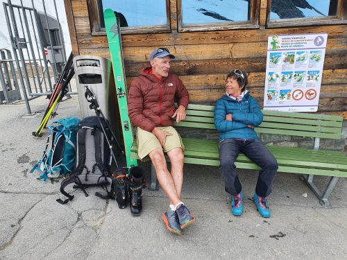 Tam už je docela teplo, ale sbírají se mraky, takže honem lyže na batoh a mažeme na Rotenboden, nekonečných 5 km mírného stoupání. Zubačka jede v 16h30, máme trochu čas. Zatáhlo se, začíná sněžit, bratříme se chvíli s nějakými Asiaty, ze Singapuru, říkám jim, že sníh asi znají jen z ledničky, ale oni že ne, že už ho v Evropě viděli. V Zermattu dáme jen rychlé kafe místo tradičního piva, cesta domů je dlouhá. V 17 h konečně sundáváme přezkáče, úleva. Doma jsem byl ve 20 h, unavený, ale spokojený. Přece jenom 2000 m převýšení do 4600 m nechodím tak často. Aklimatizace kupodivu nebyla potřeba, asi pomohly předchozí skialpové výlety, celkem pravidelná sportovní aktivita a rozumné tempo.