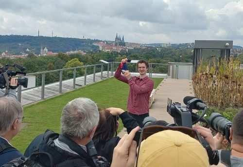 Adam Ondra s Pražským hradem v pozadí, pózuje novinářským kameramanům a fotografům před Letnou, na které bude příští rok závod Světového poháru v bouldru