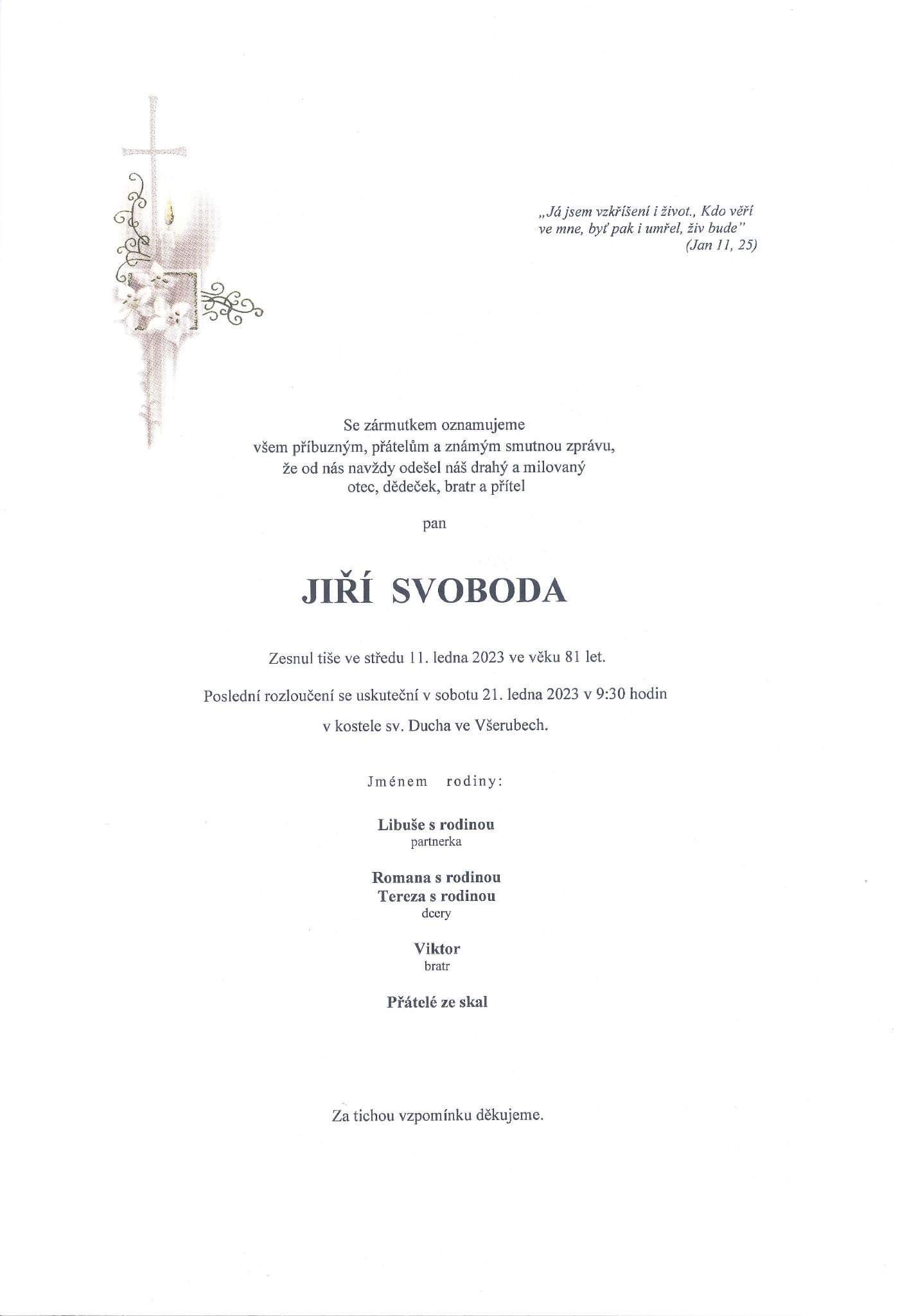 Opustil nás kamarád a lezec Jiří Taxis Svoboda. Zesnul tiše ve středu 11. ledna 2023 ve věku 81 let. Poslední rozloučení se uskuteční v sobotu 21. ledna 2023 v 9:30 hodin v kostele sv. Ducha ve Všerubech.