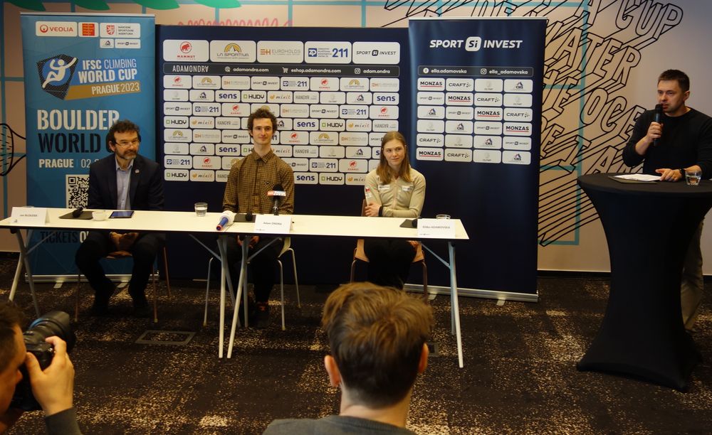 Jan Bloudek, Adam Ondra a Eliška Adamovská na dnešní tiskové konferenci k SP v bouldru v Praze 2023
