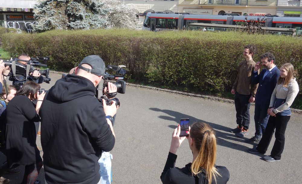 Adam Ondra, Jan Bloudek a Eliška Adamovská pózují fotografům a kameramanům na dnešní tiskové konferenci k SP v bouldru v Praze 2023
