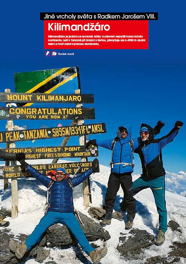 V osmém dílu příběhů o lezeckých a horských oblastech z celého světa nás Radek Jaroš zve na nejvyšší vrchol Afriky – na téměř šest tisíc metrů vysoké Kilimadžáro. Tímto vrcholem Radek uzavřel svůj několikaletý projekt zaměřený na získání Koruny světa. Příběh jeho dvou výstupů na tento vrchol jistě zaujme všechny ty horaly, kteří mají v úmyslu na tento vrchol v centrální Africe vystoupit – významná jsou Radkova slova týkající se správné aklimatizace před výstupem na takto vysoké hory. Více na str. 11-15.