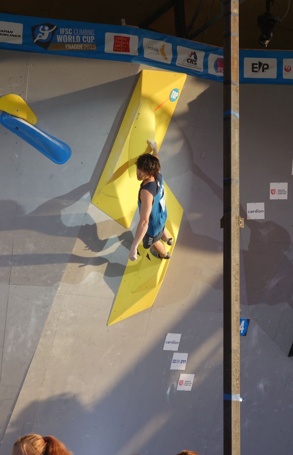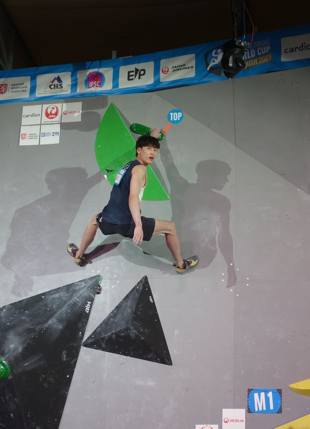 Finálový boulder č. 1 topuje Japonec Yoshiyuki Ogata, který skončil 4., SP v boulderingu v Praze