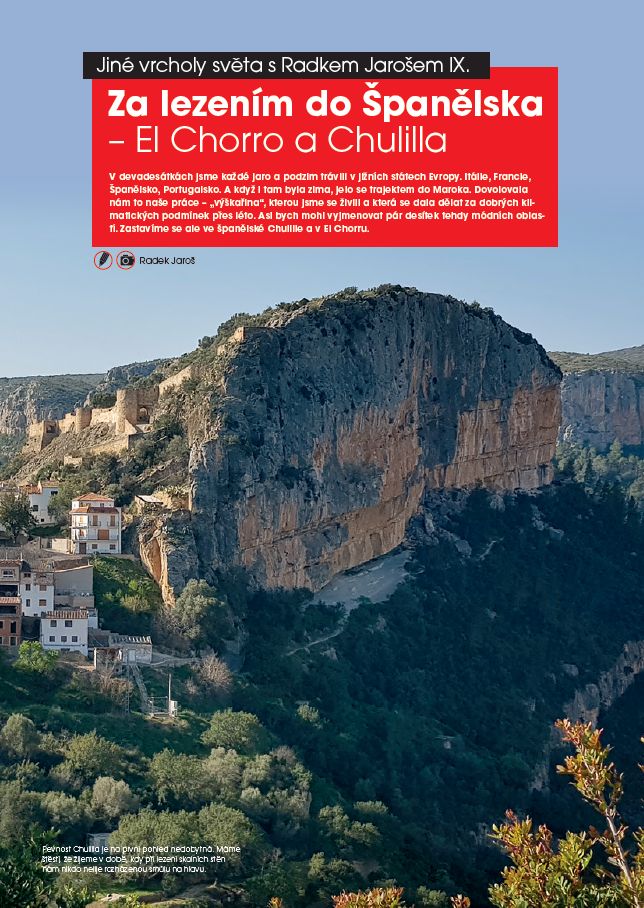 Lezecké oblasti El Chorro a Chulilla jsou ve Španělsku velmi vyhledávané. El Chorro se nachází ve vnitrozemí Španělska pouhých 50 km od Malagy. Je to vápencová soutěska, která leží v docházkové vzdálenosti od stejnojmenné vesnice. Chulilla, jedna z nejlepších horolezeckých oblastí ve Španělsku, se nachází v provincii Valencie. Řeka Turia zde vytvarovala jedinečný vápencový kaňon, který je vyhledáván lezci z celého světa. Tipy na výstupy v obou oblastech najdete na str. 11-15.
