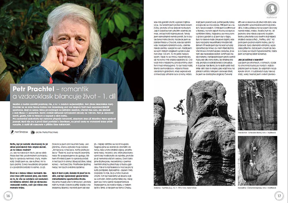 Petr Šimáček připravil pro lidé&HORY rozsáhlý rozhovor s Petrem Prachtelem, který skalám a horám zasvětil prakticky vše, a to i v dobách nejtemnějších. Petr (Peter Maxmilian Karl) Prachtel se se svou ženou Zorkou von Hasenburg und von Mayern řadí mezi nejuniverzálnější sportovce. Mají za sebou tisíce prvovýstupů na běžných skalách, včetně free solo, ale některé z nich třeba i v jeskyních. Navíc ovládli běžecké vytrvalostní závody na 100 km. Petr je obrovský bavič, grafik, hrál ve filmech a bylo o něm napsána i kniha. Mnoho zajímavých příběhů najdete na str. 16-19.