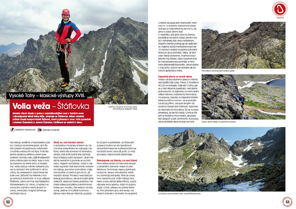 Volia veža – Štáflovka, klasika všech klasik a jedna z nejoblíbenějších cest ve Vysokých  Tatrách vede v jihozápadní stěně Volej věže. Název dostala podle známé české lezkyni Vlastě Štáflové, které ji přelezla v roce 1935 společně s Karlem Čabelkou a Janem Šabatou. Obtížnost se udává V. UIAA.  Příběh jednoho výstupu na jednu z dominantních věží nad kotlinou Žabích ples najdete na str. 52-55.