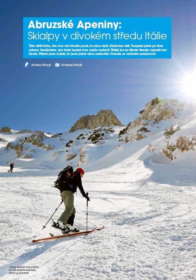Pozvání na zimní túry do velmi málo známých oblastí Abruzských Apenin a do přírodního parku Sirente-Velino. Název parku je odvozen od pojmenování vrcholů Monte Sirente (2348 m) a Monte Velino (2486 m),  nejvyšších vrcholů této části Apenin. Celá oblast je vzdálení 80 km od Říma a k pobřeží Jaderského moře je stejně daleko. Více na str. 42-45.