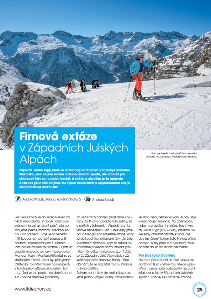 Západní Julské Alpy, které se rozkládají na pomezí Rakousko, Itálie a Slovinsko, nejsou zrovna srdcem zimních sportů, ale vrcholů nebo horských sedel vhodných pro skialpové túry tu najdete hodně. Díky dobrým sněhovým podmínkách a slunečnímu svitu je to oblast jako stvořená pro skialpové túry ve volném terénu – tipy najdete na str. 25-29.