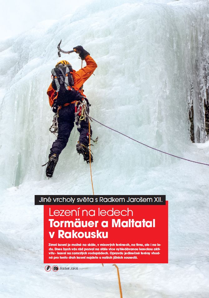 Zimní lezení je možné na skále, v mixových terénech, na firnu, ale i na ledu. V tomto dílu vás Radek Jaroš zve na stále více vyhledávanou lezeckou aktivitu – lezení na zamrzlých  vodopádech. Opravdu jedinečné terény vhodné pro tento druh lezení najdete u našich jižních sousedů. K takovýmto terénům patří Tormäuer v Dolním Rakousku nebo oblast Maltatal v Korutanech. Více na str. 15-19.