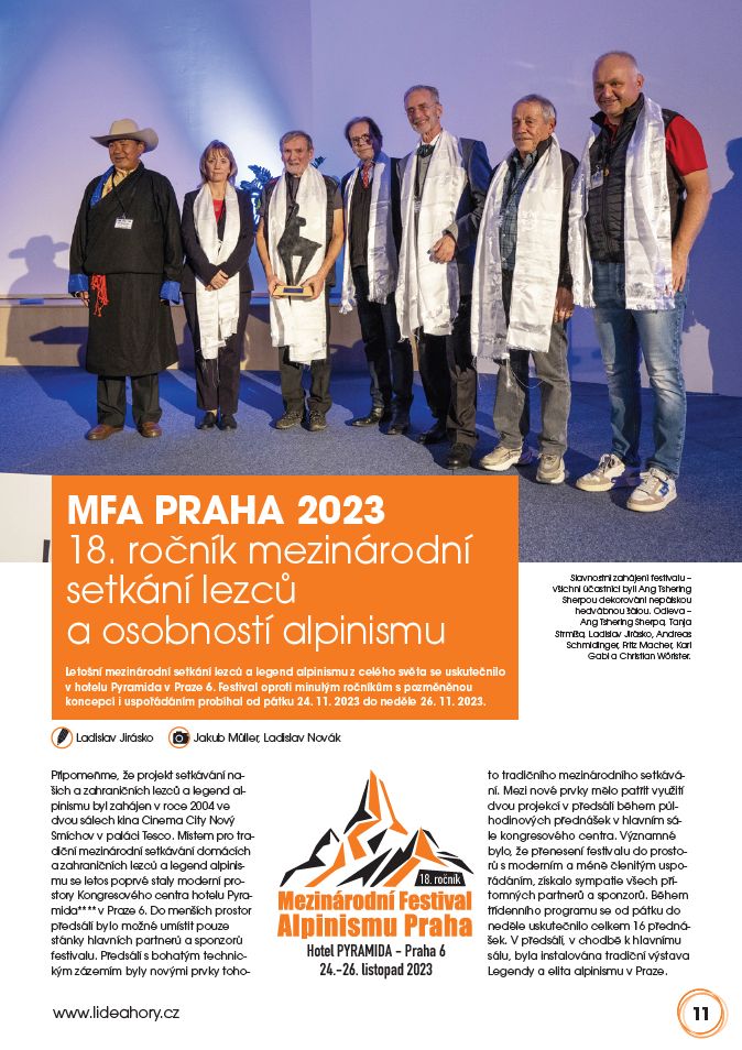 Letošní mezinárodní setkání lezců a legend alpinismu z celého světa se uskutečnilo v hotelu Pyramida v Praze 6. Festival s pozměněnou koncepcí i uspořádáním probíhal v moderních prostorách hotelu sestávajících z Kongresového centra a předsálí s moderním technickým zázemím. Během třídenního programu se uskutečnilo celkem 16 přednášek, v Praze se představili takové osobnosti jako např. Thomas Huber (DE), Simone Moro (IT), Billi Bierling (DE-CH-NEP), Karl Gabl (A), Ang Tshering Sherpa a Dawa Steven Sherpa (NEP) a další. Více na str.1, 11-14 a 81-82.
