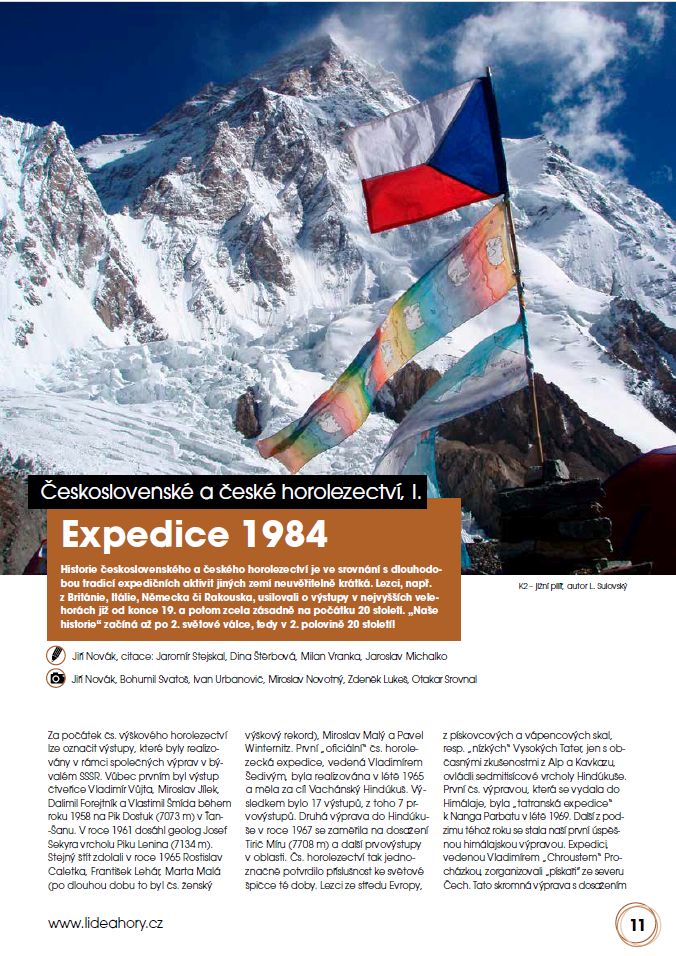 Před 40 lety se československé horolezectví významným způsobem zapsalo do historie himálajských výstupů. Formou čtyřdílného seriálu si připomeneme nejen toto jubileum, ale i mnoho podařených prvovýstupů na nejvyšší hory světa. V prvním dílu představuje Jiří Novák období od počátků československého výškového horolezectví (1958) až do fáze příprav na významné himálajské projekty (1982). Vše na str. 11-15.