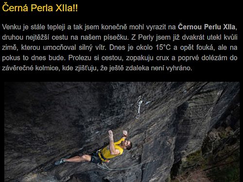 Martin Stráník si zapsal přelez cesty Černá perla XIIa, druhé nejtěžší na našich pískovcových skalách. "Pěknej silovej boulder, pak lehčí terén a vypečenej kolmáč na závěr," komentoval přelez v deníčku na Lezci. Dnes na svém blogu Martin k výkonu přidal další podrobnosti.