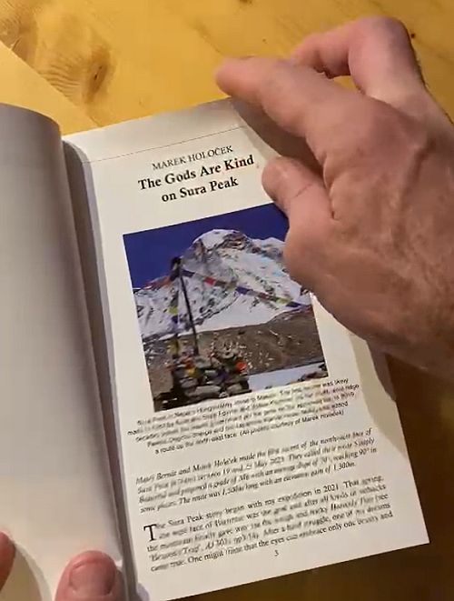 Foto Máry Holečka ze Sura Peaku se dostalo na titulku britské ročenky The Alpine Journal 2023 s nejvýznačnějšími horolezeckými výstupy uplynulé sezóny. V publikaci je jako první Márův článek o prvovýstupu severozápadní stěnou nepálské šestitisícovky Sura Peak (6764 m), který se mu spolu s Matějem Bernátem povedl vylézt loni v květnu.