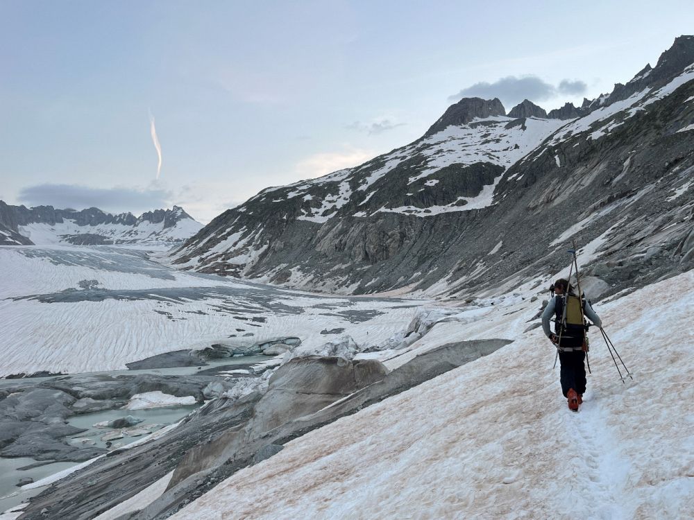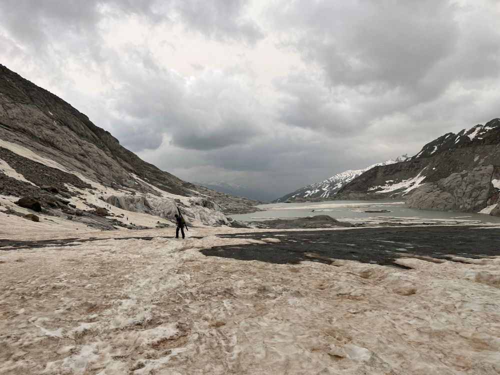 Přespáváme na parkovišti na Furkapassu, v půl páté vstáváme a sjíždíme k Belvedere. Zde je několik parkovišť, takže ráno není problém. Pobalíme, natáhneme pásy na lyže a vyrážíme. S námi samozřejmě mnoho dalších skialpinistů. Lyže zpočátku asi 15-20 minut na batohu, pak dál na lyžích. Sníh dole není pěkný, je plný saharského prachu, zbarven do žluto-oranžovo-hněda a spousta popadaných kamenů, kterým je třeba se vyhýbat. Míjíme pasáže žuly omleté ledovcem a velké plochy špinavého vodního ledu. Pomalu se dostáváme k bílému sněhu.