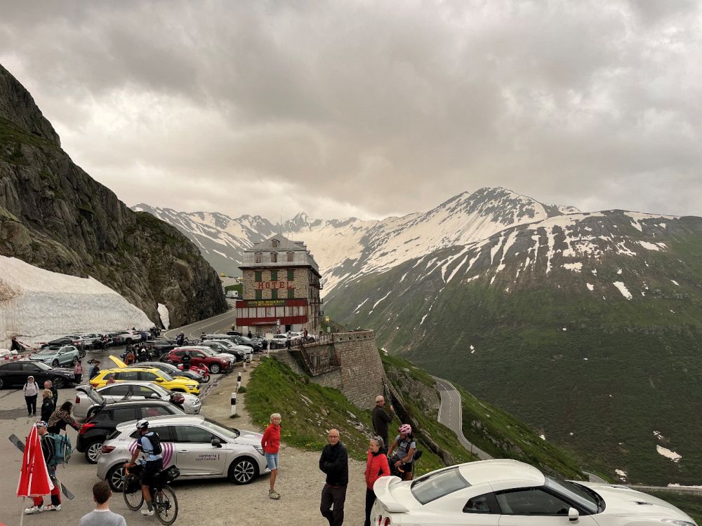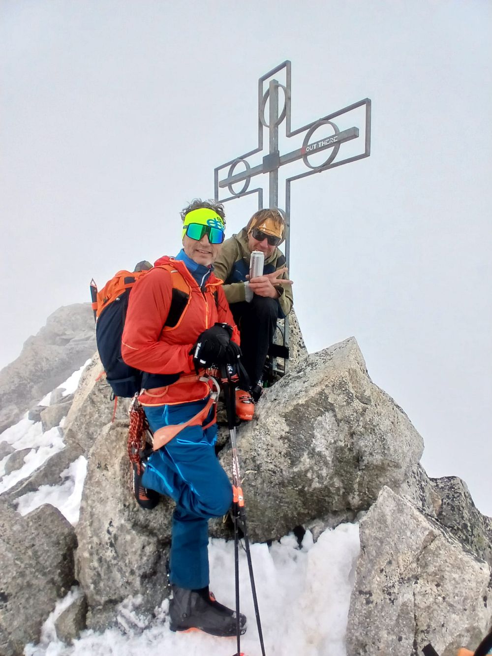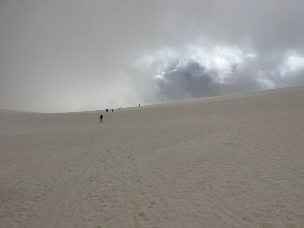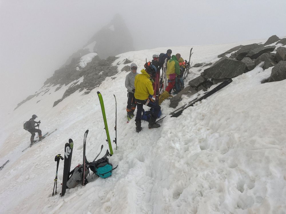 Cestou je třeba překonat velkou pláň, kde se dá slušně jít a km odsýpají. Pak přijde stoupání a nad tři tisíce ještě trochu přituhne. Přesto sklon není nijak dramatický. Předpověď však nelhala a čím výše, tím víc mraků a méně viditelnosti. Posledních cca tři – čtyři sta výškových metrů již vrchol není prakticky vidět a stoupáme v mraku. Rychlost větru již kolem 60 km/h, ale v tomhle terénu ani to není problém. Skidepo je těsně pod vrcholem a maček netřeba. Na vrcholu klasicky kříž, místo tak pro pět až deset lidí (potkali jsme se zde s kolegy Slováky, Poláky i Švýcary), za skalkou je i závětří. Moc se ale nezdržujeme, víme, že počasí se zhorší. Z vršku je sjezd trošku prudší, ale v podstatě v pohodě. Jakmile se dostáváme pod mraky, vidíme na všech stranách černo. Při přejíždění pláně vzpomínáme na Katku Neumannovou a Lukáše Bauera, protože ve změklém firnu střídáme soupaž s bruslením. Pak už sjíždíme zpět do špinavého sněhu a opět se vyhýbáme kamenům. Poslední kilometr jdeme zase pěšky. U kiosku dáme malé oslavné pivko, povyměňujeme fotky, chvilku pokecáme a jedeme dom. Druhý den v novinách čteme, co bouřková fronta nadělala ve Švýcarsku za paseku. Furka je zavřená. Přívalové záplavy, zbořené budovy, mosty, poničené silnice, dálnice a železnice, města odříznutá od zbytku světa …