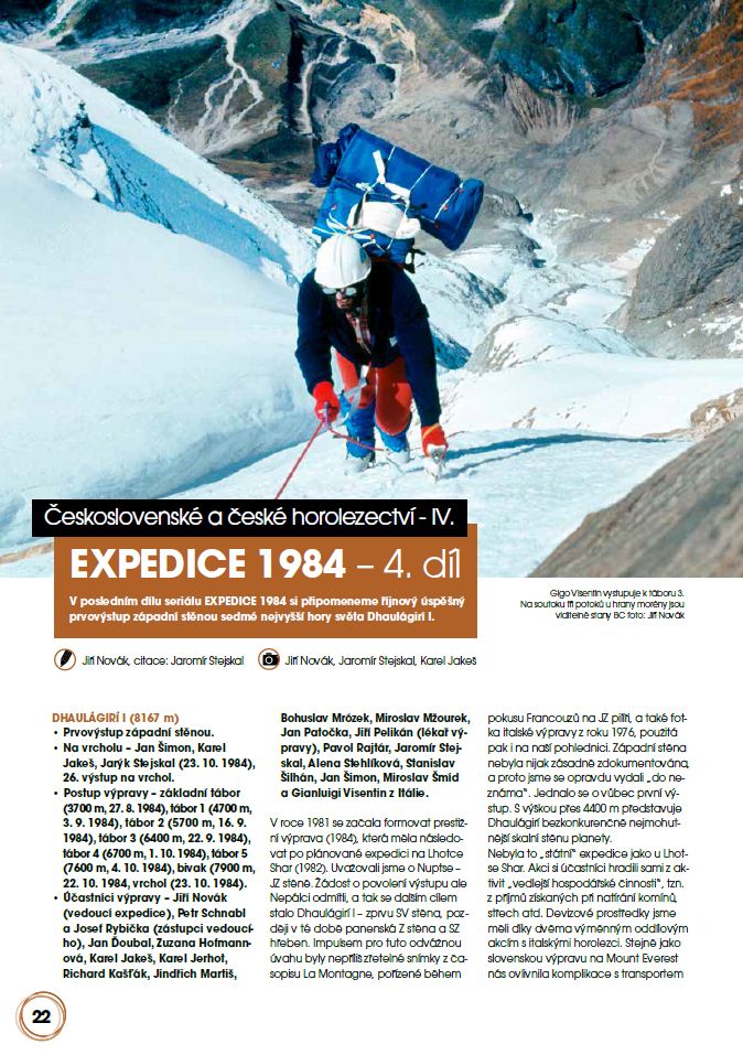 Před 40 lety se československé horolezectví významným způsobem zapsalo do historie himálajských výstupů. V závěrečném dílu čtyřdílného seriálu připomíná Jiří Novák, vedoucí mnoha československých himálajských expedic a významná osobnost československého a českého horolezectví, říjnový úspěšný prvovýstup západní stěnou Dhaulágirí, sedmé nejvyšší hory světa – vše najdete na str. 22-25.