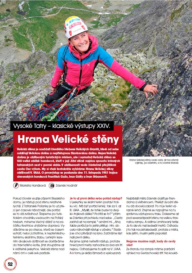 V již 24. dílu oblíbeného seriálu „Vysoké Tatry – klasické výstupy“ nás autorka zve k lezení na Velickou stěnu, která je součástí hřebene Velických Granátů. Tento hřeben odděluje Velickou dolinu a nepříliš dobře dostupnou Slavkovskou dolinu. Výstup o obtížnosti V. UIAA určitě zláká mnoho dalších zájemců – více na str. 52-55.