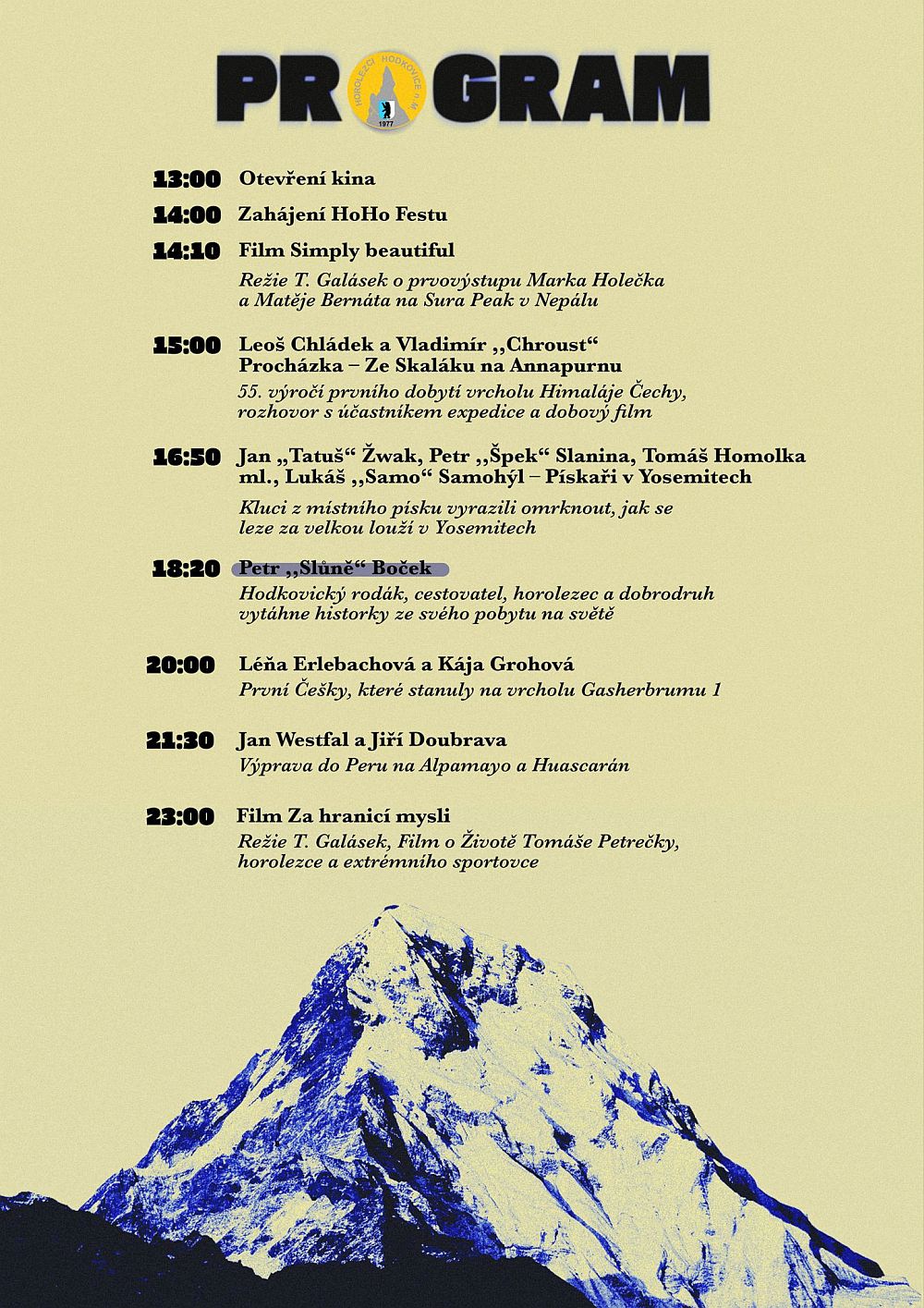 Dovolujeme si vás opět pozvat na horolezecký festival do Hodkovic nad Mohelkou. Letos vzpomeneme na 55. výročí první vztyčené české vlajky na vrcholu Himaláje.