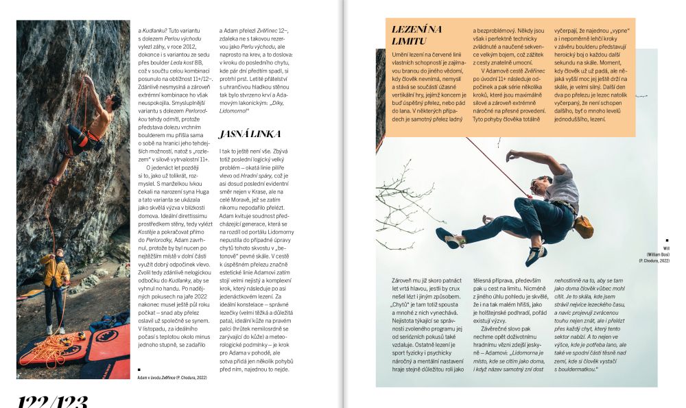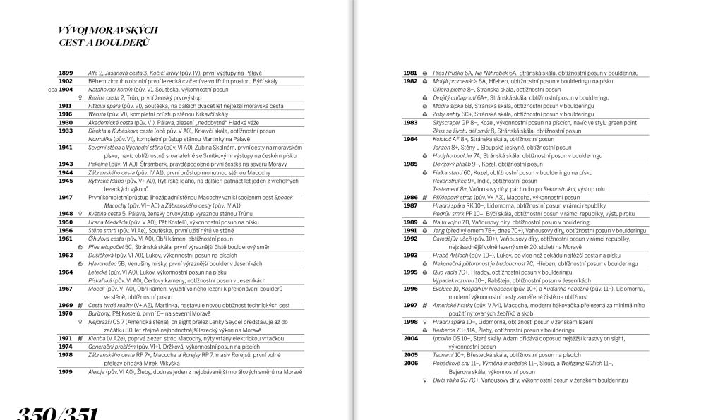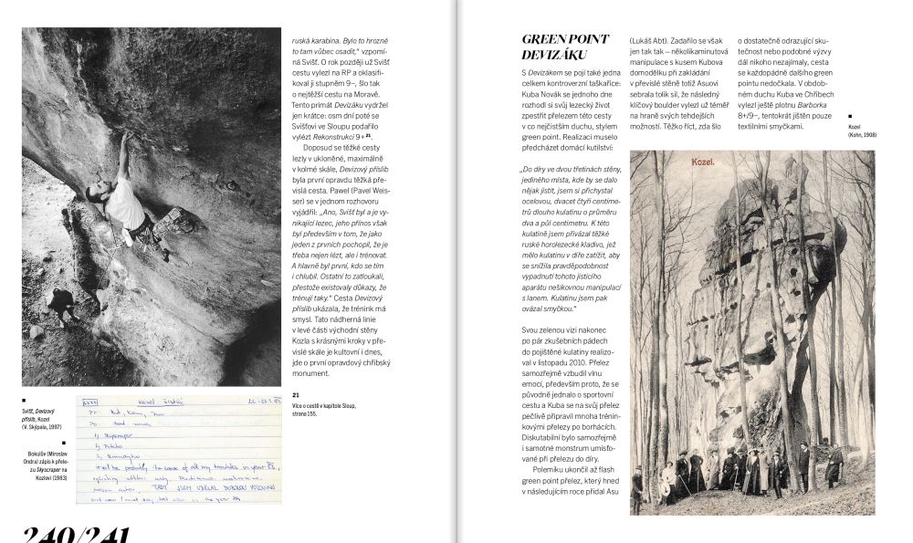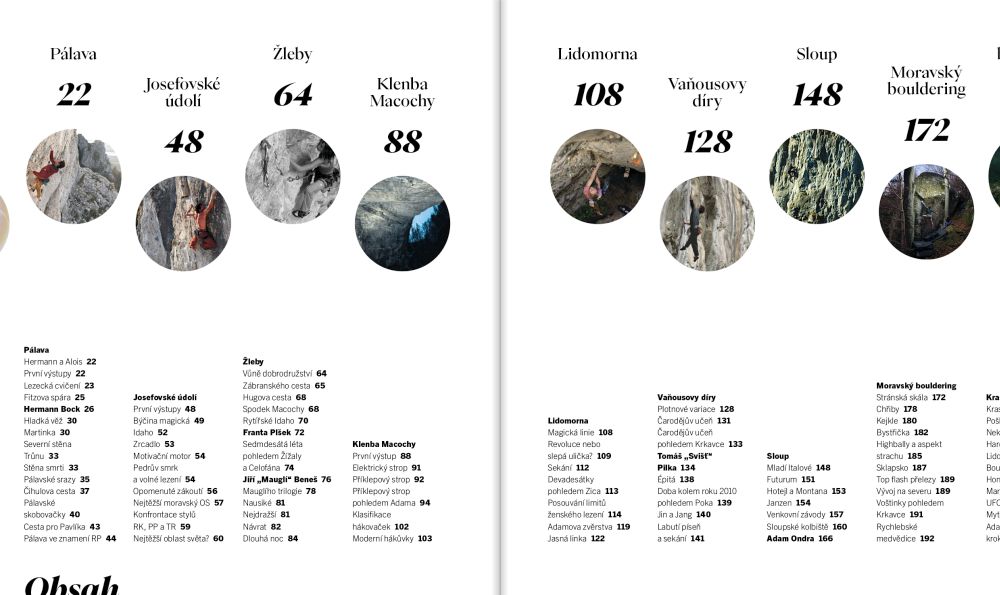 V rámci čtrnácti kapitol se seznámíš s klíčovými přelezy, přelomovými cestami a bouldery a fenomenálními osobnostmi, které lezení na Moravě významně ovlivnily. Přidali jsme také zajímavé vhledy týkající se filozofie lezení a přístupů jednotlivých lezců a samozřejmě nechybí ani seznamy průlomových cest a boulderů nebo jinak význačných počinů. Prostor je věnován také zdánlivě okrajovým disciplínám jako je drytool nebo urban climbing. Textovou část bohatě doplňuje obrazový materiál, především z dílny skvělých fotografů Petra Chodury, Kuby „Konyho“ Konečného, Pepeho Piechowicze a mnoha dalších. Historické fotky se podařilo sesbírat z archivů lezců napříč celou Moravou – veliké díky patří Bedřichu Gottvaldovi, Pepovi Kývalovi, Ivanu Bajerovi ml., Márovi Žákovi a dalším.