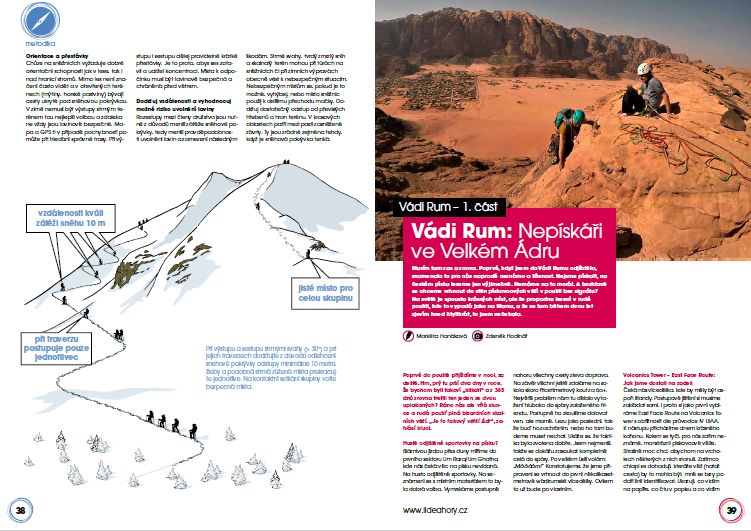 Nepískaři ve Velkém Ádru je podtext článku nového seriálu dlouholeté spolupracovnice lidé&HORY o lezení v Měsíčním údolí na jihu Jordánska. Zážitky z lezení na bizarních skalních věžích v několika sektorech uprostřed rudé pouště jsou pozvánkou nejen milovníky klasického lezení, str. 39-43.