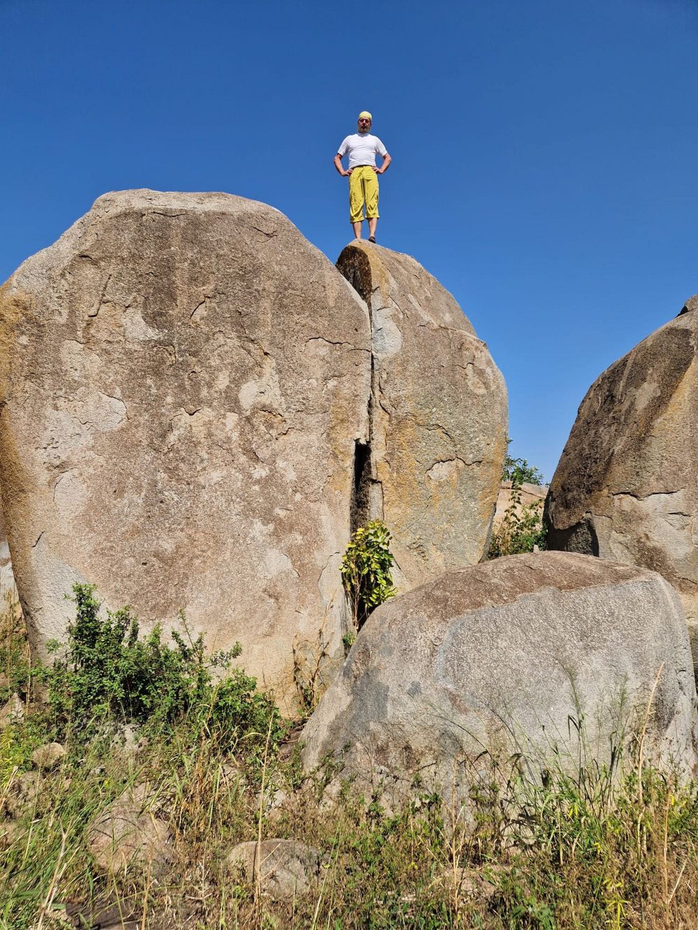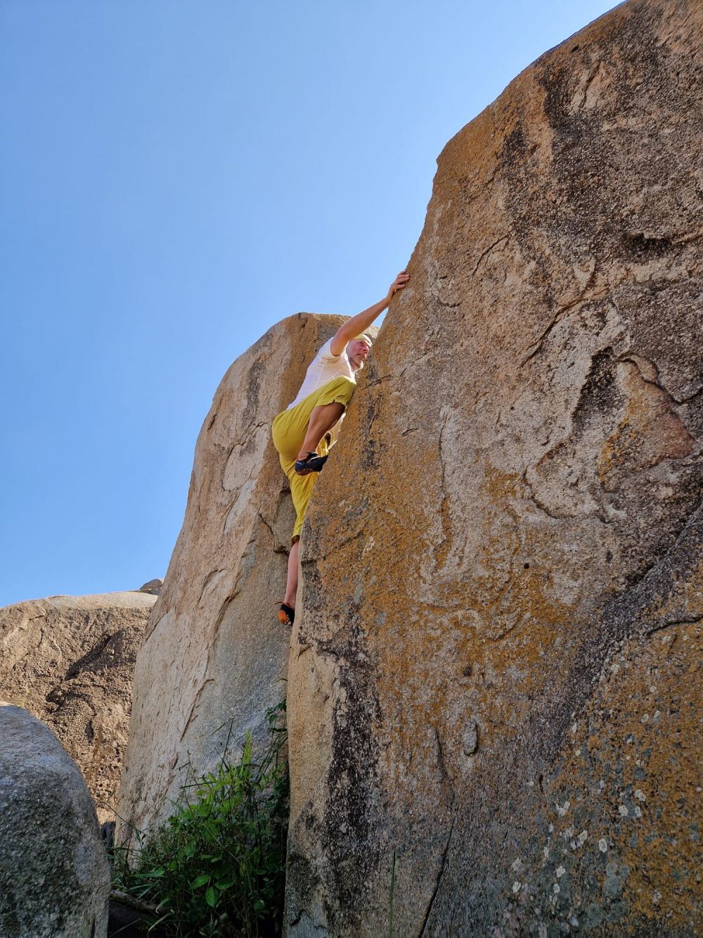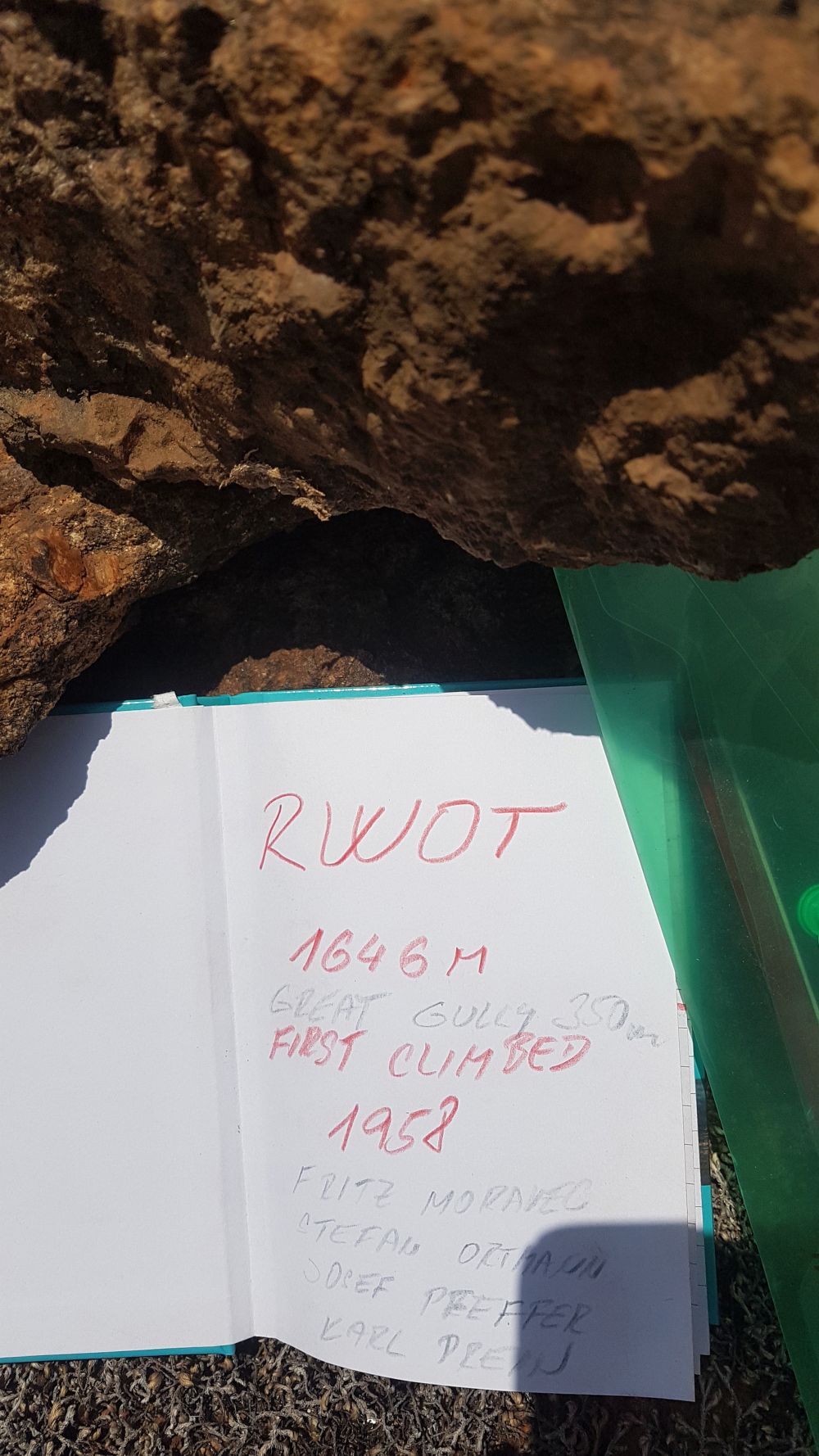 Zakládáme zde vrcholovou knihu. Podle dostupných informací na netu jsme třetí na vrcholu od roku 1958. Slaňujeme stejnou cestou zpět. Při slaňování zanecháváme smyce s majlonkami pro snadné stažení lana. Stěna nabízí mnoho dalších výstupů, ale to je již na vrtačku a osadit borháky nebo nýty. Žula je kompaktní a bez slabin.