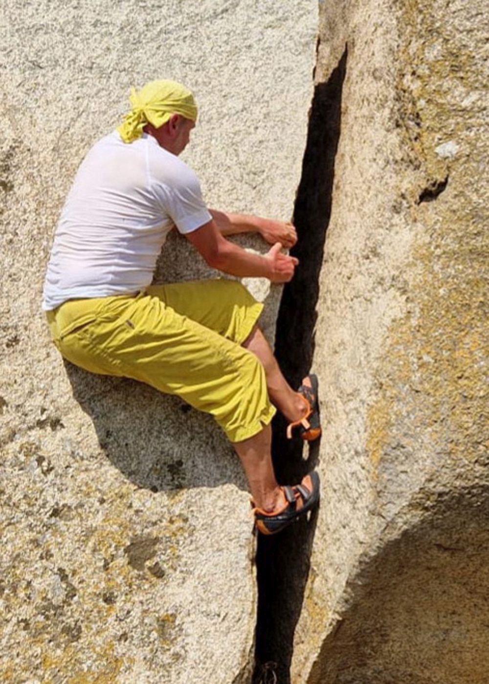 V sedmé délce pod vrcholovou částí výlezu jsem ale nezvolil správnou cestu. Komín nad hlavou byl zarostlej keři a stromy. Zvolil jsem levou stranu, že se vyhnu komínu v pevné kompaktní skále. Ta ale končila po 30 metrech a najednou jsem měl nad hlavou převislé trsy trávy. Následovaly trsy uschlé staré trávy v kolmé stěnce, nedýchat a stoupat nahoru bez jištění, kdy držím trsy trávy přilepené ke skále, občas se utrhne a letí dolů. Dolezl jsem dalších 30 m pod převis, kde jsem mohl udělat štand.
