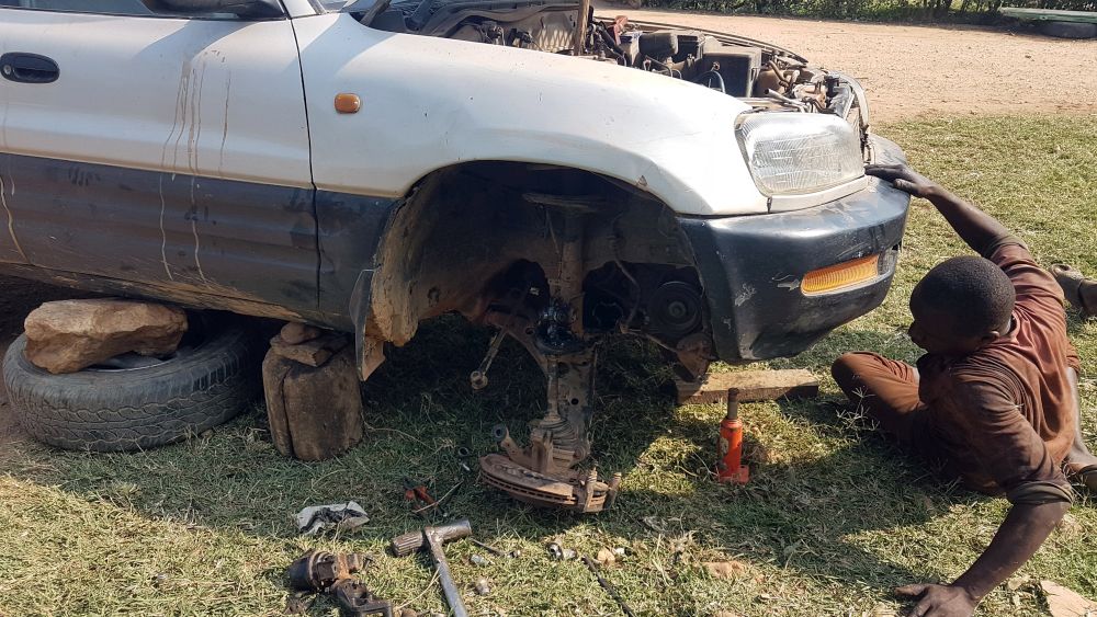 Bylo ráno 6:30 stále ještě tma. Okolo sedmé hodiny mi klepe na okénko místní mladík. Mzungo (označení pro bělochy), na které si rychle zvyknete, protože jej slyšíte neustále. Hlavně, když vás nečekaně uvidí malé děti. Mzungo nějaké potíže, ptá se mě. Auto dojezdilo. Půjčovna 1000 km daleko, na auto bychom čekali min. dva dny. Řekne: ve vesnici vzdálené asi 3 km je mechanik. Někam volá a za 20 minut přijede na motorce mechanik. Jeden šroubovák, několik klíčů a vrhá se na opravu. Vyndá starý utržený držák, že jej musí odvézt do dílny, dále našel utrženej čep řízení. Nevím kde, ale sehnal novej. Za tři hodiny opraveno. Mzungo jen platil, novej díl 50 tis -300 Kč, mechanik 200 tis - 1300 Kč, řidič motorky 10 tis - 65 Kč a můj spasitel a tlumočník si neváhal říci o 100 tis - 650 Kč, že vše zajistil. Byl jsem spokojenej, můžeme pokračovat.