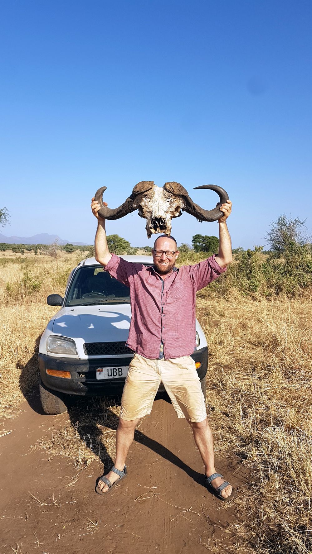 Auto máme 4x4 toyota RAV dost starej omlácenej model. Je osm hodin večer a nemáme jezdit s autem po 19. hodině. To je napsáno ve smlouvě s půjčovnou. Vysvětlujeme, že máme ubytko 140 km daleko. Dostáváme svolení od majitele, že můžeme jet velmi opatrně. V noci nesmí turisté řídit auto z půjčovny. Nejen, že se jezdí vlevo, na silnici jsou neosvětlená auta, motorky, chodci, kozy, krávy,.. Provoz je v noci obrovskej. Jako bonus naše auto svítilo max. 10 m do dálky. Zkrátka Afrika.