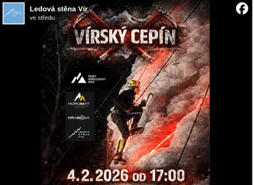 Závod v ledolezení na rychlost Vírský cepín se pořádá na ledové stěně ve Víru na Žďársku tuto středu 4. února 2026. Více viz informace na sociálních sítích ČHS a ledové stěny níže.