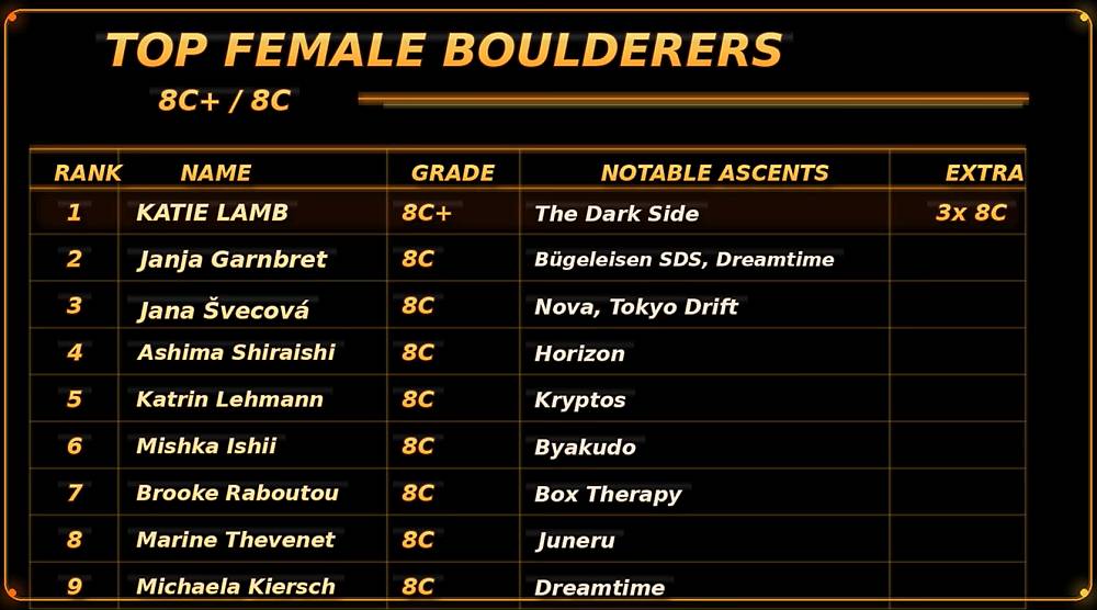 Přehled ženských top bouldrových přelezů, který je v závěru výše uvedeného videa: