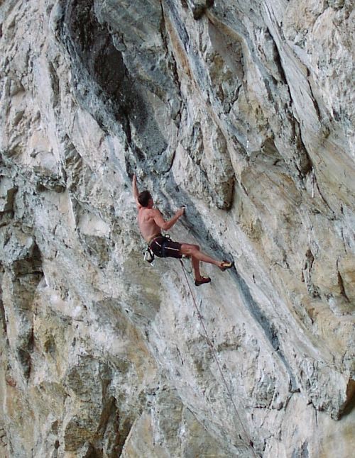 Co je mezi 8a a 9a nám ukázalo několik místních hejhuláků. Dobrá, mají to tam nachozený, ale to nijak nesnižuje to, co předváděli. S Hynkem jsme si navzájem drželi brady, museli jsme vypadat fakt zajímavě. Jeden Helmut hobloval na sucho jedno 8a vedle druhýho, pak dal několik pokusů v 8b+. Jenže, aby nalezl do 8b+ musel prokráčet 30 metrů dlouhou 8b, aby mohl absolvovat ono 8b+. Spadl několikrát po 45 metrech lezení v této obtížnosti. Vždycky když spadl, usmál se a nechal se spustit 20 metrů od nástupu, políbil Hildu a šel jí jistit do 7c. Ostatní hejhuláci na tom byli stejně v bledě modrým. Odhaduju, že za ten den nalezli každý tak 200 metrů v obtížnosti 8a a víc.