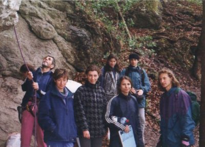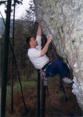 Pak jsme přejeli na Marientaler wand, kde se potvrdila domněnka, že v Německu mají taky svátek, protože zde bylo spousta místňáků. K večeru se ale skála začala vylidňovat a my jsme se také dostali k lezení. Jana i Jitka vylezli stylem OS několik sedmiček a Jirkovi se podařilo vylézt brutálně vytrvalostní cestu Strom linie PP 9 , na kterou si již brousil zuby od loňska. Hop se pokoušel nastoupit do jedné obtížné cesty ( Kraft feld ) jejíž nástup začínal nekompromisním skokem do prvních chytů a jež byla oklasifikována stupněm 9/9+.