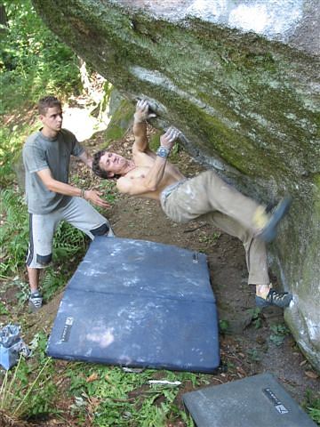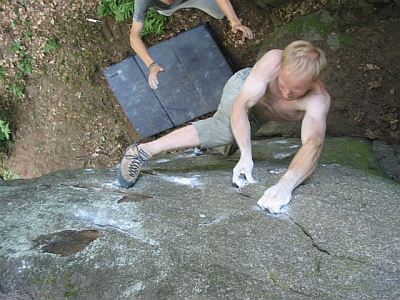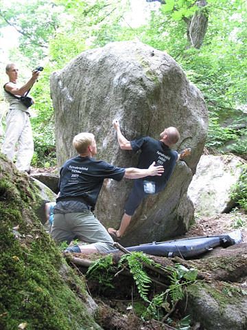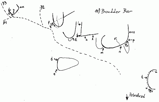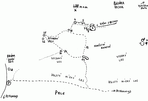 Nejtěžším kouskem je traverz „Loupež chytů“ (8A/A+ tr) od Karla Hegra, který Rosťa Štefánek vidí minimálně na úrovni „Kanagomu“ (8A) Pod hradem a horká novinka „Megaman“ (8A) od Petra Resche. Je tu ale i řada hezkých lehčích věcí, ačkoli řadě lezců činí větší problémy dát výlezové technické 6A stylu „bleau“ než silovější 7A, což se ukázalo právě i na „PADání“. Nutno podotknout, že vylezené a zde prezentované bouldery jsou zhruba třetinou potenciálu, jaký Brána má. Práce tu bylo už uděláno hodně, ale hodně jí ještě zbývá, zejména není vybudován systém cest s výjimkou té části, kde se závodilo a kde je vytvořen perfektní systém dálnic. Přístup z parkoviště je nejlepší buď k „Chatě“ svahem nebo těžko znatelnou pěšinou k „Rozcestníku“. Obojí zabere poprvé maximálně deset minut, pro znalé tak 5 minut. Z návsi je nejlepší dojít přes asfaltku od zrcadla, dále za lůmkem doleva k osamělé chalupě a od ní raději levou cestou (pravá je horší, tou jsme šli na PADání) do místa, kde se začíná mlází rozevírat do louky a zde poněkud hůře znatelnou, ale dále již profesionálně vytvořenou prosekanou cestičkou pod Boulder Bar. Z návsi je to asi 15 až 20 minut. Celkovou dispozici Brány v rámci Petrohradu najdete na starších schématech jež jsou na Lezci. Už je na čase začít pracovat na skutečně přehledném průvodci!!! Příjemné polezeníčko přeje Petr Resch a Karel Hegr, PAD team a Letovská stavební.