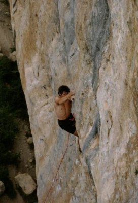 Brzy ráno jsem zkusil Moi et Lui 8a , ale únava odsunula tuto nádhernou cestu až na příští rok. Snad. Smutně jsem se vracel do Kaskád , kde mi trochu náladu spravil Luky , který již měl po pokusech a s vykloubeným prstem se zájmem sledoval pokusy Hynka, který přesto, že mu ve svalech evidentně dřímá dostatečná síla, přelezení této cesty nedokázal a zcela ji vzdal. Šimi si ji pak vylezl také a prohlási , že se mu cesta líbila. Pak ji ještě vylezl Dandy. Ještě několik posledních cest např. Les Daltons 6b+ a zbývalo už jen balit. To nám trvalo asi hodinu . Pak jen nešťastně se zamženým pohledem poskakujeme po cestičce vinoucí se dolů. Jako ve snách nakládáme věci do auta. Již nás nepobaví ani místní blázen zvaný Miňumiňu , který nám, jako ostatně pravidelně, šumuje v autě a hledá něco k jídlu. My bez pohnutí stojíme, v pohnutí hledíme do krajiny a nevšímáme si ho. Jen dojatý Šimi mu podá sušenky se slovy: " A teď vypadni šmejde !"a on se již uklidněn vzdaluje a ševelí " Miňumiňu, Miňumiňu."