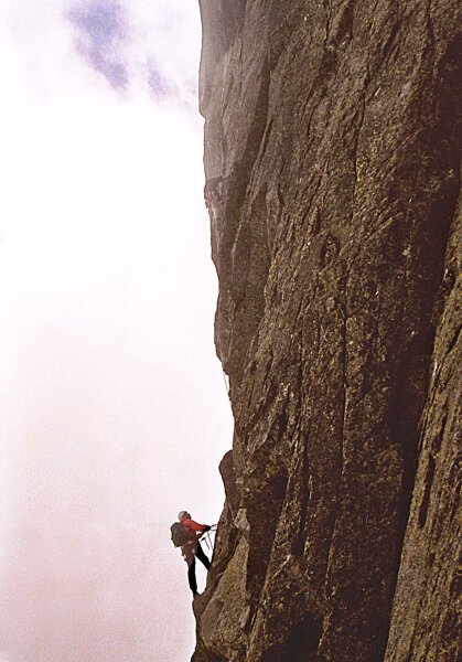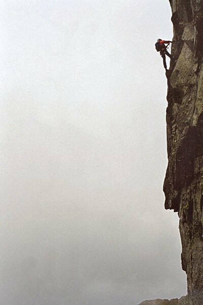 ... Lano sa kľukatilo stenou a bolo čím ďalej ťažšie, jeho trenie bolo členitosťou  terénu zvýšené na maximum a prvolezcovi sa len s vypätím všetkej sily darilo postupovať nahor. Zatlčená skoba vyzerala byť bezpečná, no dlhý odlez a prípadný pád by znamenal nepríjemnosť a nutnosť ústupu.