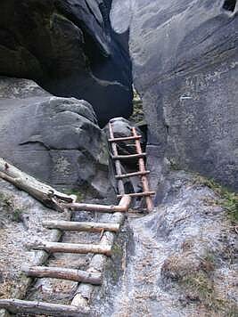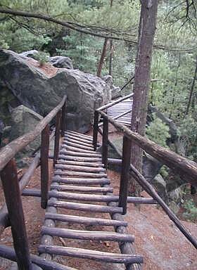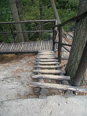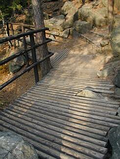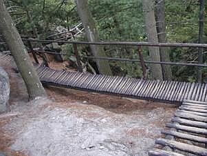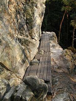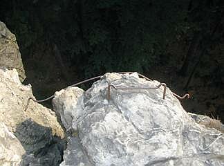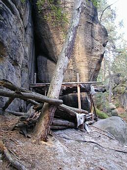 Přesuneme se na skálu na panteonském hřebenu. Tady jsou systémy schodů, žebříků a zábradlí přímo u turistické cesty. Vznikla tato hrůza.
