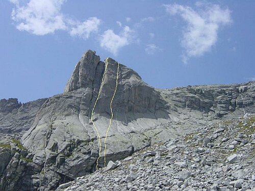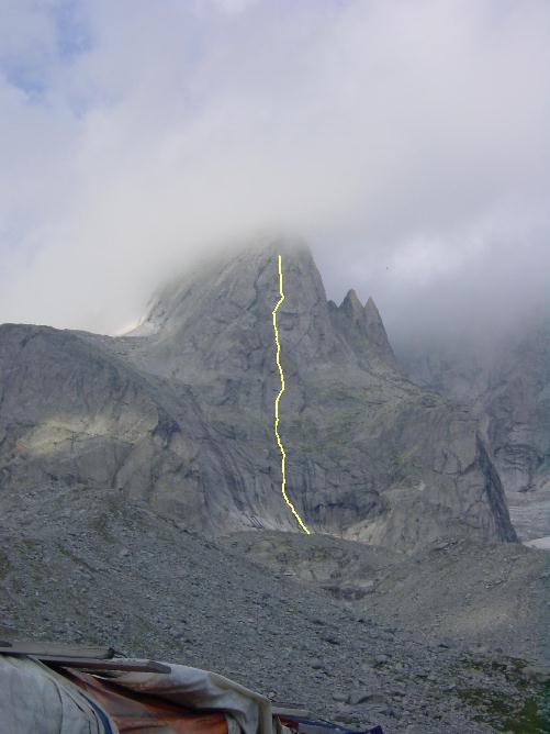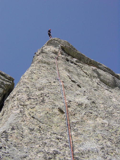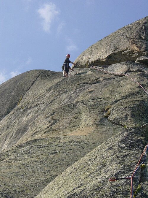 Pro rozlezení a seznámení se s klasifikací volíme cestu Guronsan 5c+ na Pizo Torrone Occidentale – devět délek v pevné ledovcem ohlazené a ochlazované skále. I v letošním tropickém létě zde teplota nevystoupila nad 15° C. Z cesty je dobře vidět do stěn Punta Rasica a Punta Allievi.