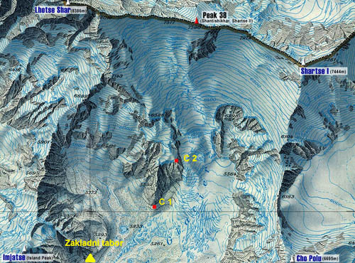 ctverecek) tesne pod upatim JV hrebene na Lhotse Shar. Z C1 do C2 to vypada