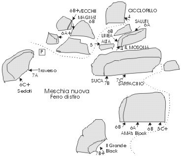 Tahle super boulderová oblast v Itálii v  Meschii nabízí přírodní linie s maximálním respektem pro skálu a přírodu. Klasifikace je podobná Fb a lezení problémů je také podobné bez “eliminantů” - všechny chyty jsou platné + super okolí = pro boulderisty ráj.