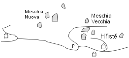 Když ji minete dejte se směrem na Romu, pokračujte po cestě doprava a asi po  6 km směrem na Rocca Fluvione. Pokračuj po značce na Monte Gallo, pak zatoč doleva pokračuj ještě 6 km a zatoč opět doleva na MESCHIi.
