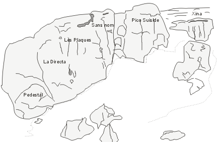 Sektory, které spatříte, když stoupáte po vlnící se silničce z městečka, nejsou k přehlédnutí a jejich působivé panorama se vám nabídne hned ze silničního parkoviště, kde by auto mělo zůstat zcela vyprázdněné a zbavené všech cenných věcí, které by mohly lákat poberty. Zaparkujete v rozšířeném místě silničky asi 200 m nad kempem u kamenné zdi. Po překročení potoka, většinou vyschlého dojdete nejdříve k sektoru Pedestral, výše se pak nachází vysoký La Directa, divoký Les Plaques a ještě divočejší Sans nom a Pico Suicida. Do nejvýše položeného sektoru Xina, který není tak velký, jak by se mohlo z údolí zdát, je třeba uhnout doprava a vystoupat po cestě. Tady končí sportovní lezení, neboť Xina je levým křídlem této skvělé gigantické formace s názvem Penya Roya a kde je možné nalézt až 4 délkové cesty.