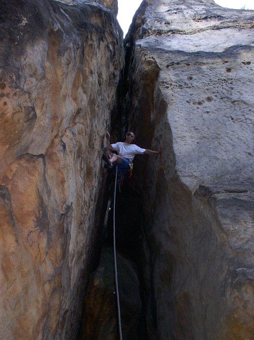 Vím, že jsem letos seriál poněkud zanedbával, a pokusím se tento prohřešek příští rok odčinit. Méně psaní ale vůbec neznamenalo méně lezení. Rok 2003 byl úžasný a ve velké míře strávený právě v Sasku. A to i navzdory krátkému jaru, předlouhému a přehorkému létu a polovičatému podzimu. Velký duch Saska, Sas Maior, vyslyšel mé dlouholeté prosby a seslal mi parťáka. Krejčího, který nikoli horkou Jehlou sešil ruksak, z něhož se vydařené dny sypaly jeden za druhým. Parťáka zapáleného pro Sasko. A neúnavná pravidelnost, se kterou jsme každý týden zdolávali v časných ranních hodinách hraniční přechody, přinesla své ovoce.