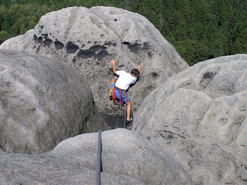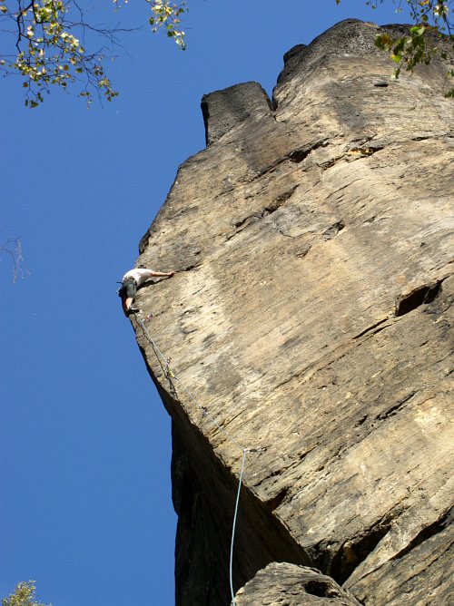 Srpnové letní parno. V poměrně svěžím ránu dorážíme pod vysoké wandy Schrammsteinů. Cíle nejasné co do cest a jisté co do věží. Chceme vylézt něco na alespoň jednu z věží ze skupiny Osterturmů a Schrammturmů tyčících se mezi Ostervorturmem a Dreifingerturmem. Nutnou podmínkou je orientace na zastíněné strany. Nakonec nám padne do oka Aborigines VIIIa od Manfreda Vogela na Nördlicher Osterturm, novější cesta křižující klasický Bumerang VIIc. Podle průvodce 8 kruhů a od pohledu velmi dlouhá. Ve skutečnosti ještě delší. K prvnímu kruhu výborný rozporový komínek a pak už hranou do Bumerangu a ještě o kruh výše zaštandovat. Zleva přes rajbásky a další kruhy. Rajbásky jsou velmi zvláštní, čnějí z nich růžky jako když se z hroudy těsta kus utrhne a ihned ztuhne. Až sem je cesta relativně příjemná. Na konci rajbásků začíná klasika, ne těžká, ale  bez jištění. Tedy ne až na zem, jen s potenciálním třicetimerovým pádem někam do komína. Nu, nejdříve položenou plotnou vzhůru a hodně doleva až pod pěkný žlab, jímž šouravě, solivě a klouzavě na polici. Tou zpět doprava pod kruh. Nebylo by normální, kdyby se dal cvaknout hned a jeden riskantní krůček už nikomu neuškodí. A pak už na předvrchol. Protože je celá cesta jinak pěkná, myslím, že by nebyl velký hřích obejít závěrečnou pasáž zleva nějakou pětkou. Co ona však v sobě skrývá nevím. Na předvrcholu je osazen borhák a to je moc dobře. Vrchol se dobývá přepadopřelezem přes hluboký komín plný závratí. Vrchol je sladkou odměnou, oblé hlavy okolních věží Schrammsteinů jako na dlani. Ale nejvíce poutá pozornost oblá hladká hrana na věži na severovýchod od nás. Ba co víc, není na ní vidět jediný kruh. Na chvíli se mě zmocňuje neopodstatněný chtíč a vzrušení, že by snad stála i za prvovýstup. Že by se o ni dosud nikdo nepokusil? Nesmysl. Takové linie se v Sasku nevynechávají. Pak ale musí absence kruhů znamenat téměř jistou nelezitelnost. Při pohledu zvrchu to tak vypadá. Ale stejně by i marný pokus stál za tu již téměř zapomenutou robotu s kovárnou.
