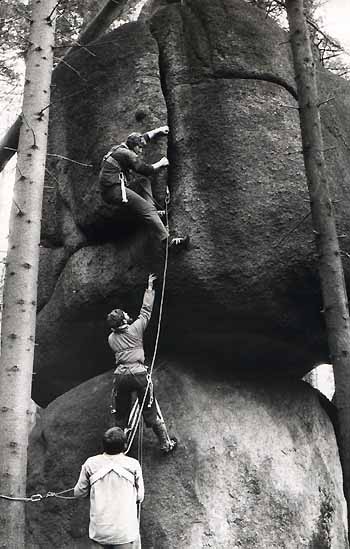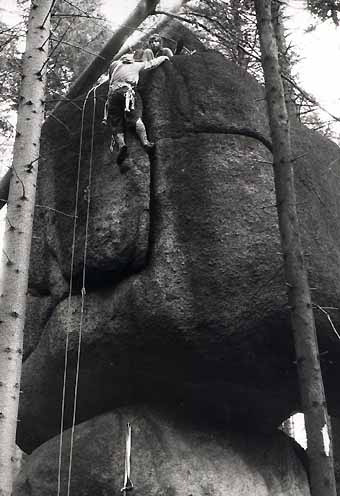 Představu o tomto směru  (a jeho délce)  je možno si udělat z černobílých fotografií z prvovýstupu - obr.4 a obr.5. Za povšimnutí  stojí, že lezec nemá pytlík s magneziem a o tom, že bylo teplo svědčí  oblečení lezce. V roce 1984 (tedy v době Prachtelova prvovýstupu) byla Kauschkova věž ještě v lese. Jeden smrk rostl v těsné blízkosti JV hrany a po provedení prvovýstupu byl autorem cesty odstraněn („aby to ostatní neprasili"). Mimochodem to bylo uděláno dosti diletantsky a výsledkem byl asi půl metru vysoký špičatý pařezo-kůl.  Odhlédněme teď od toho, že to byl zásah do cizího majetku a neoprávněná těžba, a komentujme tento krok čistě z horolezeckého zhodnocení problému. Smrk opravdu umožňoval „komínový" výstup na  hlavní blok. Po vylezení cesty by při opakováních opravdu asi sváděl „k prasení" a věrohodnost výstupů by devalvoval. Vzhledem k tomu, že byl ale odstraněn až po provedení prvovýstupu, logicky devalvoval i věrohodnost prvovýstupu. Pokud už prvovýstupce přikročil k jeho odstranění, měl tak provést před výstupem (pochopitelně s výše uvedenými výhradami). Fotografie z prvovýstupu a komentář se objevily ve vývěsce HO LIAZ v Jablonci nad Nisou a úplně náhodou je tam tenkrát objevil Emil Novák - tehdy již legenda lezení v Jizerských horách. O obsah nástěnky projevil zájem a nechal si pořídit kopie.  Odtud snad pramení mýtus a mylná informace Michala Maděry, že autorství nebylo uznáno  kvůli stromu.  Skutečnost, že v horolezeckém průvodci Jizerských hor z roku 1999 je u této cesty (a dalších) uvedeno „autorství a klasifikace neověřeny" , je trochu jiná, dlouhá a složitá historie, jejíž prezentace  se zcela vymyká  tématu tohoto článku. Obtížnost cesty (Boulder17 - Frýdlantská cesta) v Saské stupnici (navrženo  přímo autorem cesty) je IXa. V té době  víceméně běžná obtížnost. Arnold již v těchto letech vytvářel desítky a v Americe už byla špička na klasifikaci 5.13b. I s přihlédnutím k té zcela zbytečné šmouze s časově špatně načasovaným odstraněním smrku je třeba Prachtlův prvovýstup považovat za pozitivní příklad respektování vývoje. Doba již nazrála na vyřešení tohoto problému, přišel lezec s odpovídajícími schopnostmi a problém vyřešil. Správnost a logičnost této cesty potvrdil i další vývoj. Cesta je dnes  opakovaně lezena. Protože foto prvovýstupu je z historických důvodů černobíle, snad pro zpestření tedy barevné foto z léta 2003 z této cesty - obr: