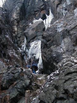 Byl docela tříštivý, pokrýval skálu poměrně tenkou skořápkou. Do ní se prakticky nedal zavrtat šroub tak, aby byl schopen zachytit případný pád. Jištění bylo na stoncích stromků ve stěně, ve spárkách pomocí smyček, vklíněnců, abalaků nebo friendů a v několika místech ve fixních skobách. Zhruba v polovině cesty byl štand - dvě skoby provázané smyčkou. Při lezení  se zimním kladivem, cepínem a mačkami jsem se hrabal potokem. Ač se mi původně šahat do vody vůbec v tom mrazu (- 5 st C) nechtělo, nakonec jsem byl dost promočený. Ale důležitější v danou chvíli bylo bezpečně lézt a jistit.